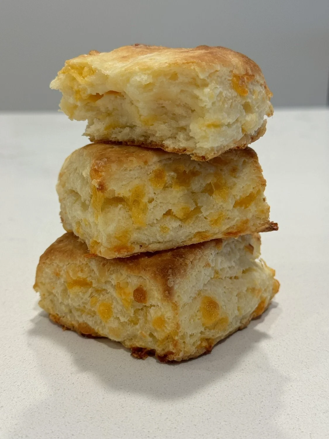INGREDIENTS: Flour (enriched flour (wheat flour, niacin, reduced iron, thiamin mononitrate, riboflavin, folic acid), leavening (sodium acid pyrophosphate, baking soda, monocalcium phosphate), salt), Buttermilk (cultured milk, modified corn starch, salt, carageenan, pectin, vitamin D3), Butter (sweet cream, salt), Cheddar Cheese (milk, cheese culture, salt, enzymes, annato color), and Dubliner Cheese (milk, salt, cheese cultures, enzymes).