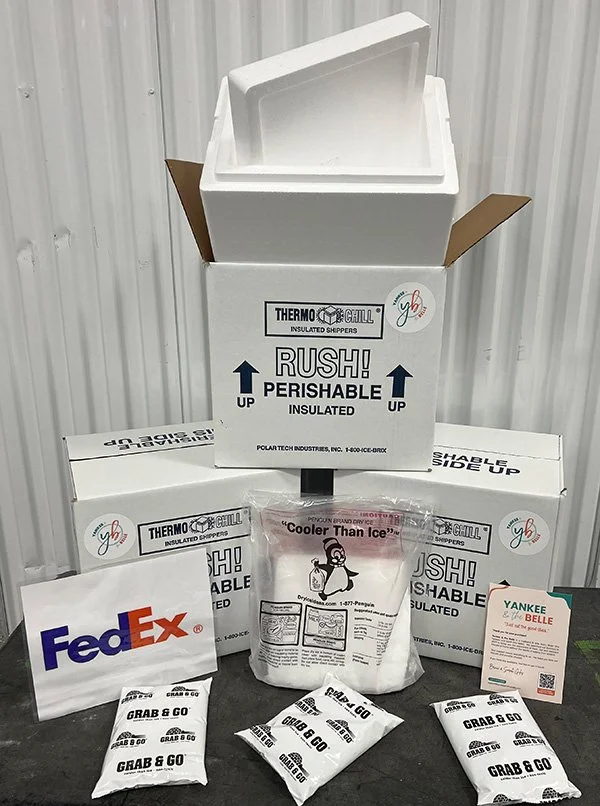 Orders that include biscuits and pimento cheese will be shipped in the same insulated box with dry ice to keep the biscuits frozen and ice packs to keep the pimento cheese chilled.